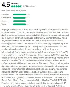Sunrise Aqua Joy 4* on perekuurort, mis asub Hurghada kesklinnas kaunil türkiissinise vee ja privaatse saarega rannal. Hotellis on mitu välibasseini täiskasvanutele ja lastele ning suur veepark. Kohapeal on palju restorane, sealhulgas a la carte restorane, baare basseini lähedal, fuajees ja mujal. Hotellis toimuvad üritused, konverentsid, pulmad rannas, basseini ääres või aias.